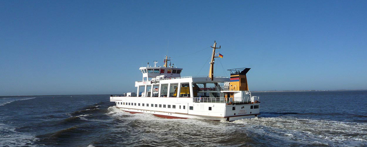 Ab Norddeich-Mole fahren mehrmals täglich Fähren der Frisia nach Norderney und zurück. In der Hochsaison fahren sie stündlich und manchmal sogar häufiger als im Fahrplan angegeben je nach Bedarf. Auf jeden Fall wird garantiert, dass bei rechtzeitiger Ankunft zur letzten planmäßigen Abfahrtszeit jeder am gleichen Tag noch zur Insel gefahren wird. In der Nebensaison fahren die Fähren stündlich oder im 1,5-2 Stunden-Takt. Nur bei einem zu großen Sicherheitsrisiko wie bei starkem Sturm, extremen Niedrigwasserständen und gefährlichen Eisschollen wird der Fährverkehr eingestellt. Eine Fahrkarte können Sie direkt mit Ihrem Bahnticket kaufen oder am Fahrkartenschalter am Hafen in Norddeich-Mole. Wenn Sie Ihr Auto mit auf die Insel nehmen möchten, werden Sie automatisch zu einem Fahrkartenschalter geführt, an dem Sie aus dem Auto heraus Fahrkarten für Mensch und Auto erhalten. Ein Nachlösen von Fahrkarten auf dem Schiff ist nicht mehr möglich.