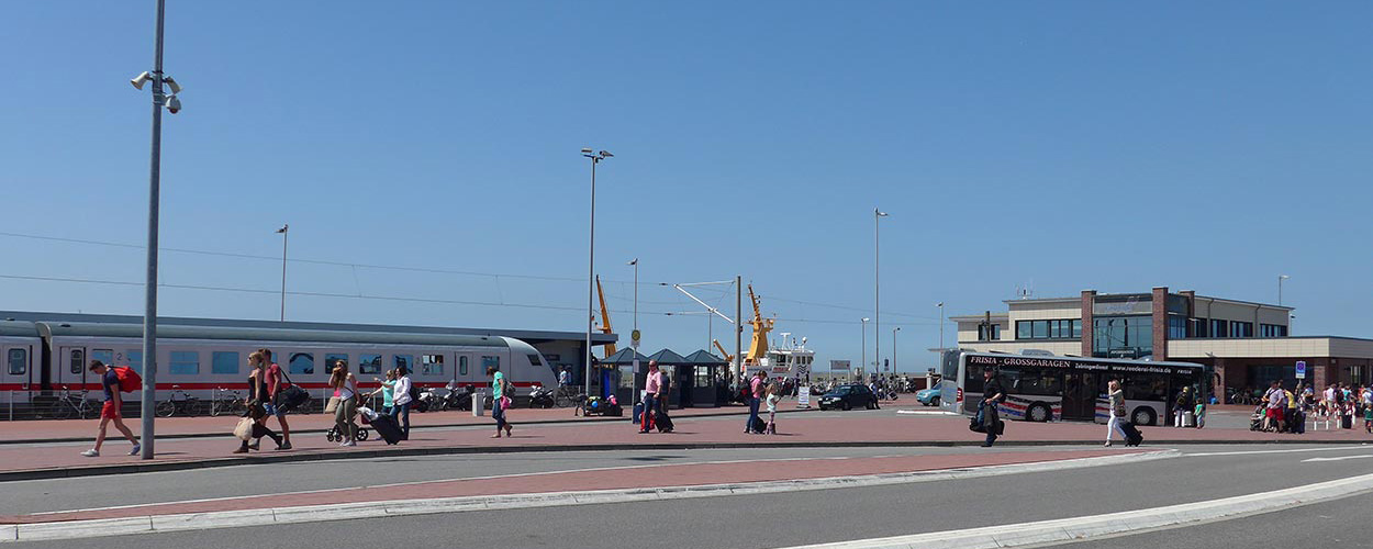 Züge der Deutschen Bahn enden direkt im Hafen Norddeich-Mole. Vom Bahnsteig sind es nur wenige Meter bis zur Fähre, die man prima zu Fuß gehen kann. Bitte beachten Sie beim Lösen Ihres Bahntickest darauf, dass Sie bis Norddeich-Mole fahren. Es gibt auch einen Halt in Norddeich, der ist aber gut 500m vom Hafen entfernt. Sie können über Ihr Bahnticket auch schon die Fahrkarte für die Fähre buchen. Die Züge sind zeitlich meist so getaktet, dass Sie bis zur Abfahrt einer Fähre keine längere Wartezeit haben.